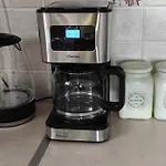Une bouilloire électrique sont utilisables dans une cuisine complète. Une terrasse invite les clients à se détendre.